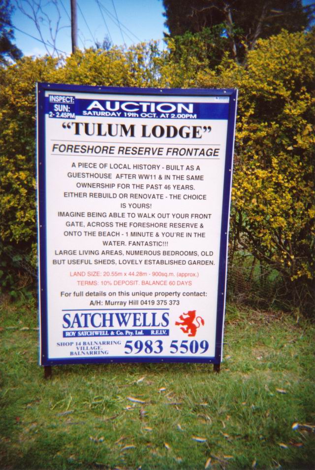 HISTORYBalnarring Beach 2002. Tulum Lodge sale.