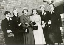 Group of eight people, 1947This image shows a group of eight people at a presentation. There are five men, two women and one young girl. The man on the right is presenting a framed document to the man on the far left. The woman on the left is holding a large bouquet of flowers and the young girl is holding a small posy of flowers. Everyone is very well dressed.