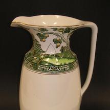 JarCircular stoneware beer jar coloured beige with conical light brown top. Screw stopper and rusted metal handle. Makers name and decoration in black within a decorative boarder. Decoration consists of 2 arms holding glasses of bear, medals, a lighthouse, a sinking ship and crude maps of Australia and New Zealand.