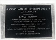 Plaque, 1984This image shows two metal plaques attached to a stone. The top rectangular plaque reads: ‘Hastings Foreshore Tree Planting’. The square plaque below reads: ‘Victoria 150 growing together 1984-5 This project marks the 150th Anniversary of the State of Victoria, commemorated in 1984-5. Unveiled by Cr. Vincent Booth Shire President November, 1984.”.