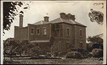 Sutton GrangeThis photograph shows a grand three storey brick building, with a central tower. It has an arched verandah to the ground floor, with a central arched entry. The roof appears to be slate with a large chimney. There are steps up leading to the main entry. There are sash windows, with a decorative white brick design around each one. There are trees surrounding the house.