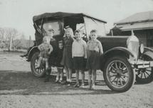Frean Family and car, c1932Image of a woman and young boy seated in the car, man standing with one foot on the running board and a young boy seated on the running board. The car is parked at the rear of a house whose tiled roof is featured quite prominently.