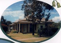 Main Street opposite Queen Street, MorningtonThis photograph shows a line of people in Victorian dress outside a brick building with a large arched doorway. The women are wearing long dresses and hats. The men have three piece suits, and hats.There is a verandah with four posts to the edge of the pavement. To the left of the building is a picket fence, and a girl is pushing a pram, and a black dog is shown.