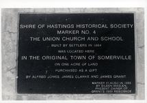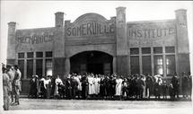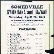 Aerial photograph, c. 1960This aerial photograph shows a town with two major roads intersecting. Paddocks surround the township and a shoreline and water is at the top of the photo. Typed in black on a piece of white paper at glued to the top left-hand corner is: “Somerville from the air - Early 1960’s”.