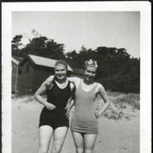 Children on Shire Hall BeachThe image is depicts three young children on the Shire Hall beach, They are seated together and playing in the sand. A tree is in the foreground three bathing boxes are featured to the right. The red bluffs are in the background.
