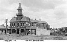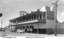 Grand Hotel, Mornington, 1934This photograph shows the Grand Hotel on the left of the picture, with small residential properties alongside. Outside the hotel is a truck parked. On the opposite side of the road are several businesses, with verandahs. One is marked “Refreshments”. On the side of the same building it has painted “Houses, Land, Agents”.