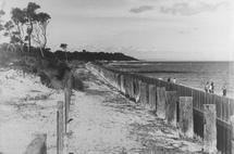 Balnarring Beach 1960. Erosion protection posts and Gwen Temby.