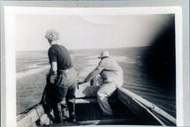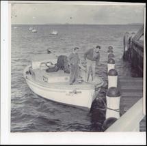 Jetty and Boats, c. 1930This photo of a jetty and boats has been taken from the shore. The wooden jetty has rail tracks down the middle and a small crane at the end. Several fishing boats are tied to the jetty. Fishing nets are handing over the side of the jetty. Three of the boats have a man on board. Another man is leaning over the jetty rail.
