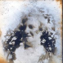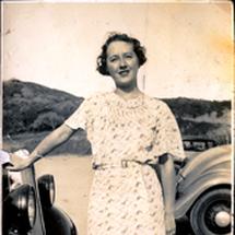 Woman, c. 1950This image shows a young woman standing on the grass in front of a very large group of people, smiling for the camera. She is well dressed in a cream coloured suit and her hat is tilted to the side. She is holding a clutch purse in her left hand. She is wearing dark coloured gloves and two toned shoes.