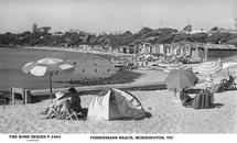 Shire Hall Beach, 1928Beach scene with bathing boxes nestled up against the foreshore, a group of bathers on the sand in front of the water. The foreground is low lying vegetation on a sandy soil.