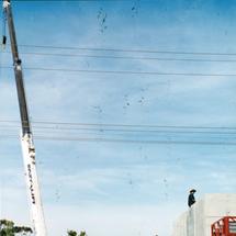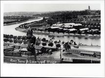 Brick building, c. 1960This image shows a two story brick office building with a man, dressed in a suit walking towards the footpath. The building has many windows across the front and side and a single story section joins on right-hand side. A lawn is across the front of the building with a stone retaining wall. A footpath is across the front of the image. A round plaque is attached to the front of the building....