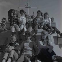 Somers School children on a Melbourne Cup Day picnic on a RN workboat travelling from HMAS Cerebrus to Cowes. 1966.