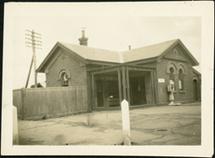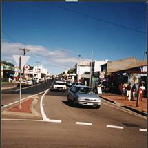 Main Street, MorningtonLooking up Main Street from the Esplanade, c1925, Police Station on the left obscured by trees, with several people walking past the Station and the ‘Federal’ is on the right in the distance several cars can be seen