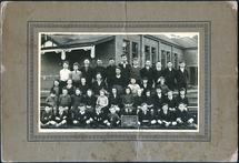 School children, 1898This image shows a group of approximately one hundred children sitting and standing in front of a brick wall. The image is very faded but the girls appear to be dressed in white pinafores and the boys dark coloured pants and jackets with large white collars. There appears to be three adults standing at the back of the group. Four large windows are along the brick wall. The photographers sta...