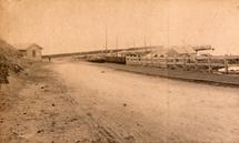Horse drawn buggy, c1900Very faded image of a horse drawn buggy with a man dressed in a coat and hat seated in the vehicle holding the reins. The buggy is stationary outside a substantial stone building with arched doorways. The image has been mounted in a beige coloured board, with the name of the photographer at the bottom.