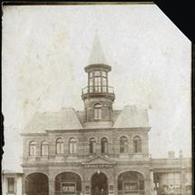 Buildings Main Street, MorningtonGrand Hotel on right with 5 sections of mansard roof and verandah with tiled front to façade to second storey single storey buildings/houses on right